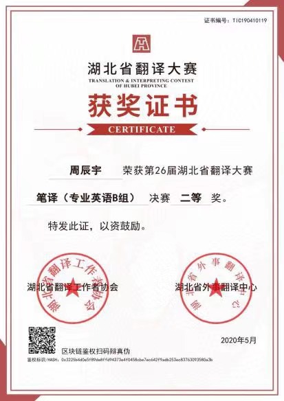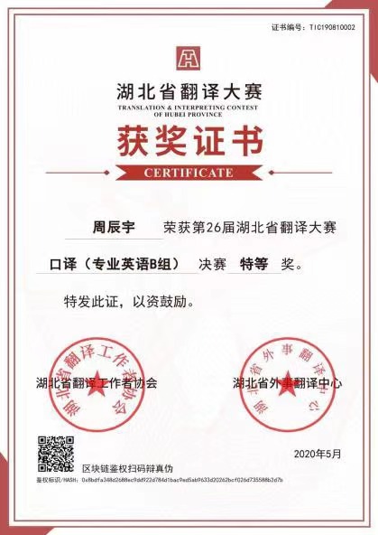 周辰宇曾获湖北省翻译大赛口译特等奖和笔译二等奖