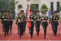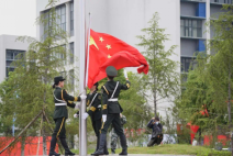 伴随着国歌响起,由我校国旗护卫队护送至升旗台的五星红旗在全体师生的注目礼下冉冉升空,现场庄严肃穆。