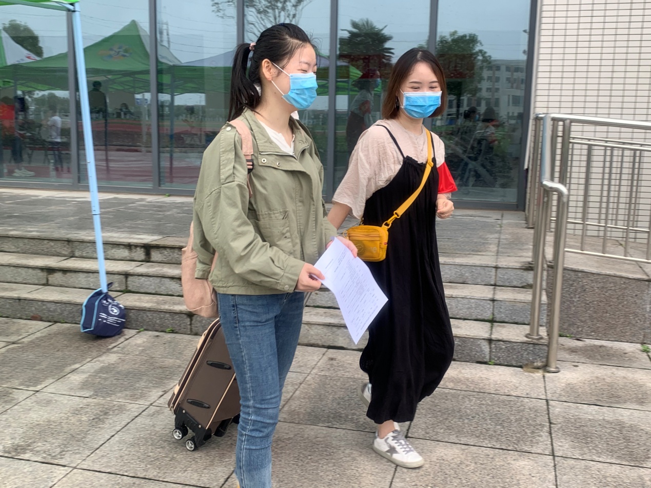 体育馆前,负责引导学生的政法学院志愿者老师对我们说,特殊时期家长不方便进来,大包小包的东西都是学生们自己扛,有时候要跑好几趟,我们来搭把手,累就累点,但能让他们快点办完手续回家,减少人群聚集。