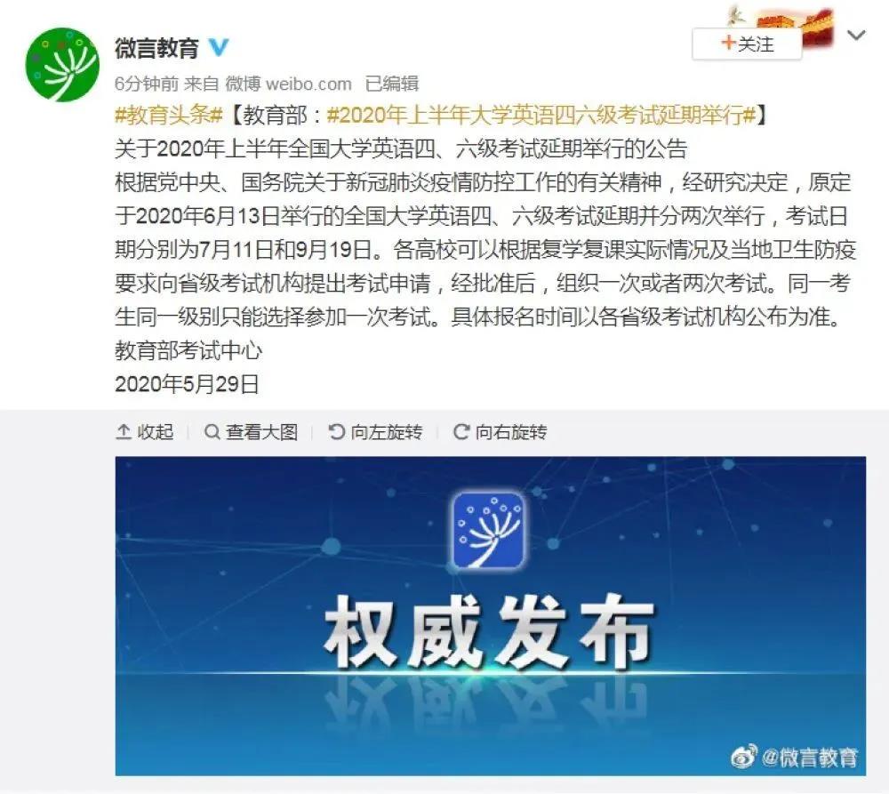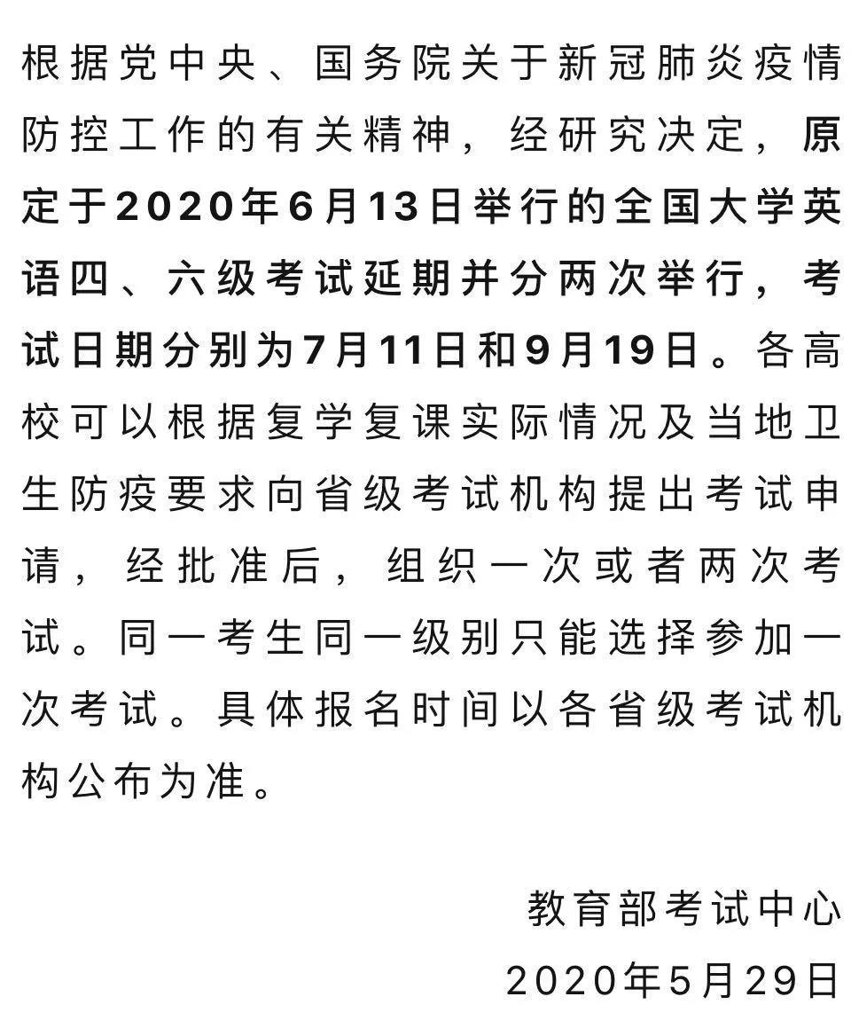 关于2020年上半年全国大学英语四、六级考试延期举行的公告