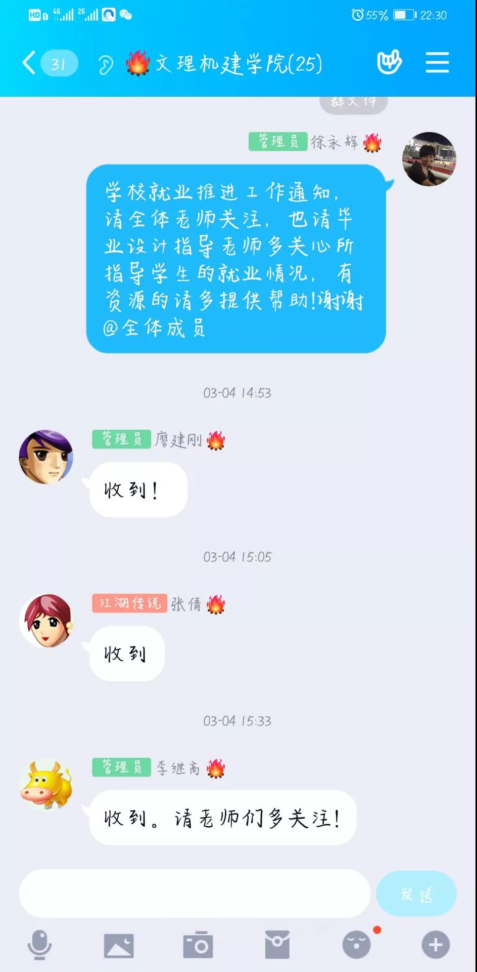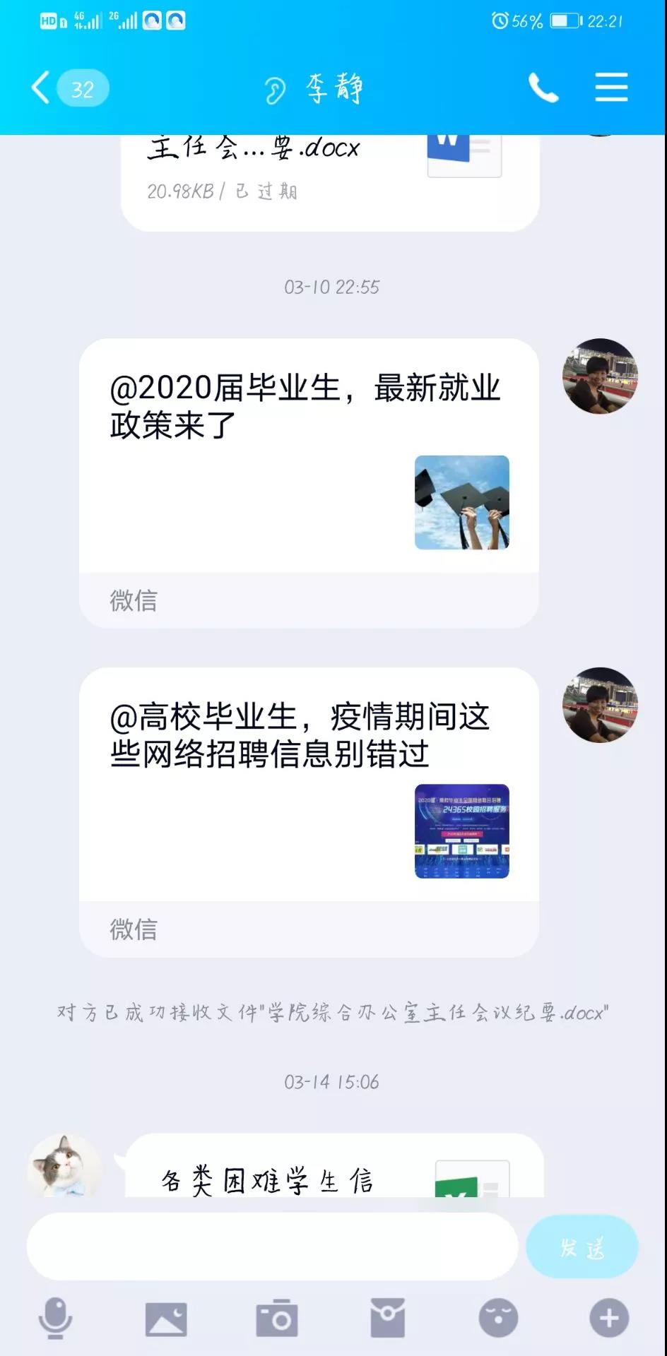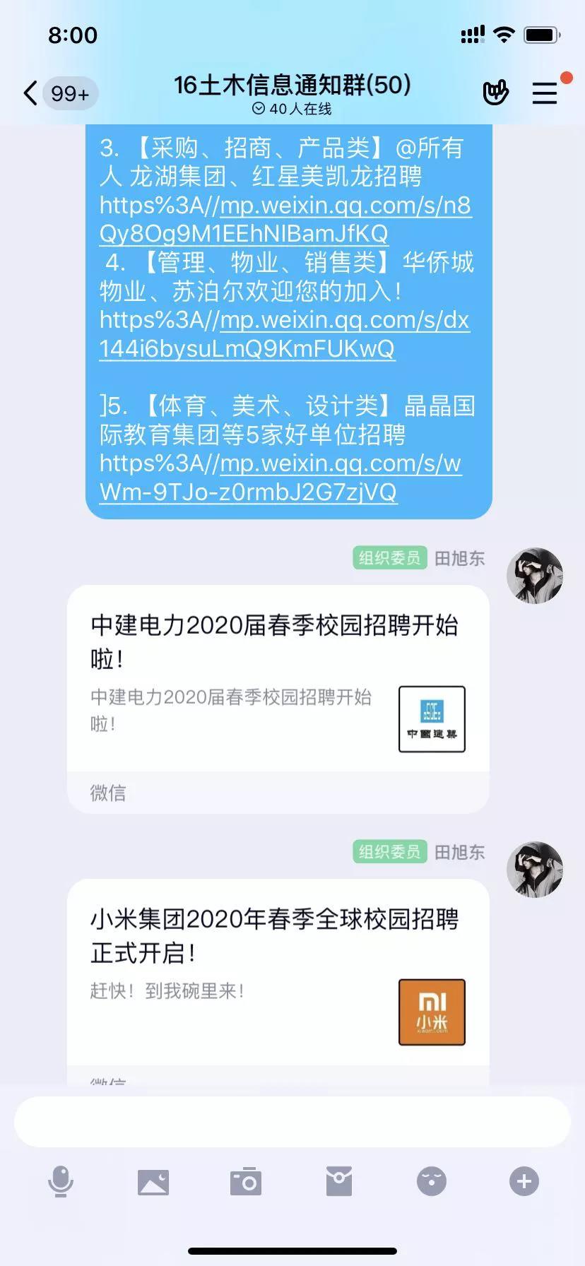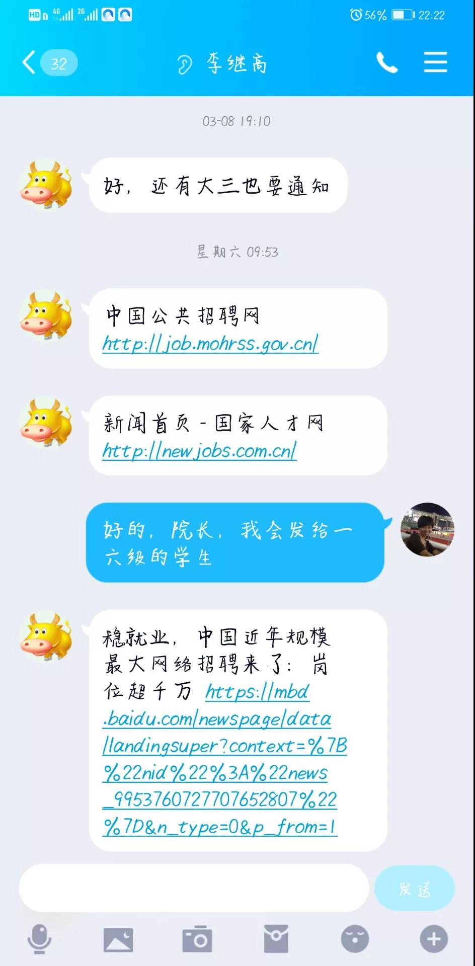 在此特殊时期,学生的就业形势愈发严峻。机电与建筑工程学院的师生一同为学生的就业问题展开行动。机建学院院长李继高和学办主任徐永辉等通过QQ群积极宣传就业政策,帮助学生了解就业形势与政策,增强学生就业的主动性和积极性,避免同学们有问题无处问,产生焦虑和困惑,影响其就业,同时每天在网上查询并收集各种就业信息并及时发布消息给同学们提供途径了解就业工作,充分利用网络和人脉资源,拓宽了同学们的就业渠道,提高了同学们的就业率。而16级土木工程班委田旭东等同学也时时刻刻关注着各个有关就业的平台并分享一些信息给同学们,让同学们能够不必过于担心疫情对就业工作的影响,减轻焦虑,以好的心态准备毕业论文。