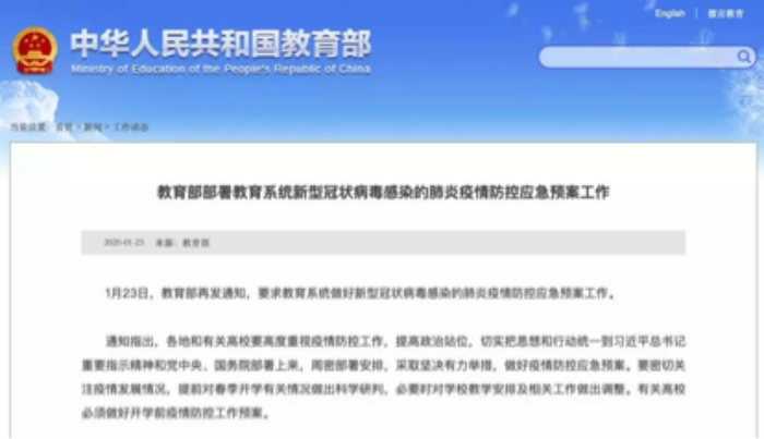 1月23日,教育部再发通知,要求教育系统做好新型冠状病毒感染的肺炎疫情防控应急预案工作。