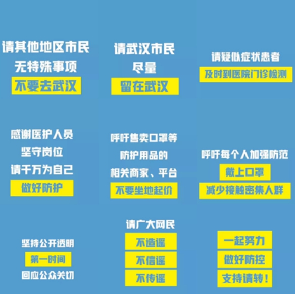 疫情发生后,党中央、国务院非常重视,习近平总书记作出重要指示,李克强总理作出批示,为我们全面做好疫情防控工作,指明了方向,坚定了信心。国家卫健委的专家组一直在汉开展工作。目前,全市防控工作正按照统一部署有序展开。 但疫情防控形势依然严峻,防控疫情,人人有责,每个人都可以为防控出力:出门戴口罩,不要不习惯;勤洗手,不要嫌麻烦;常通风,不要不当回事;不随地吐痰,不乱扔乱倒少;去人多的地方,没有要紧的事不离开武汉;不信谣,不传谣;如果感觉不适,要及时去医院就诊,等等。