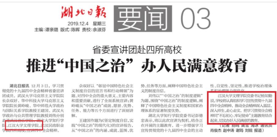 编者按:12月4号湖北日报第3版以《推进“中国之治”办人民满意教育》为题对省委宣讲团来我校宣讲十九届四中全会精神作了报道。