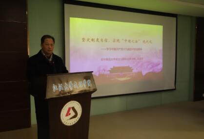 2019年12月3日上午,学习贯彻党的十九届四中全会精神省委宣讲团成员、华中师范大学政治与国际关系学院副院长、博士生导师王建国教授到我校作了题为《坚定制度自信,实践“中国之治”的现代化》的主题宣讲报告。宣讲会由党委书记杨知勤主持,全体校领导、党委委员、全体思想政治理论课专职教师、各基层党组织书记、委员、各学院师生代表济济一堂聆听了报告。