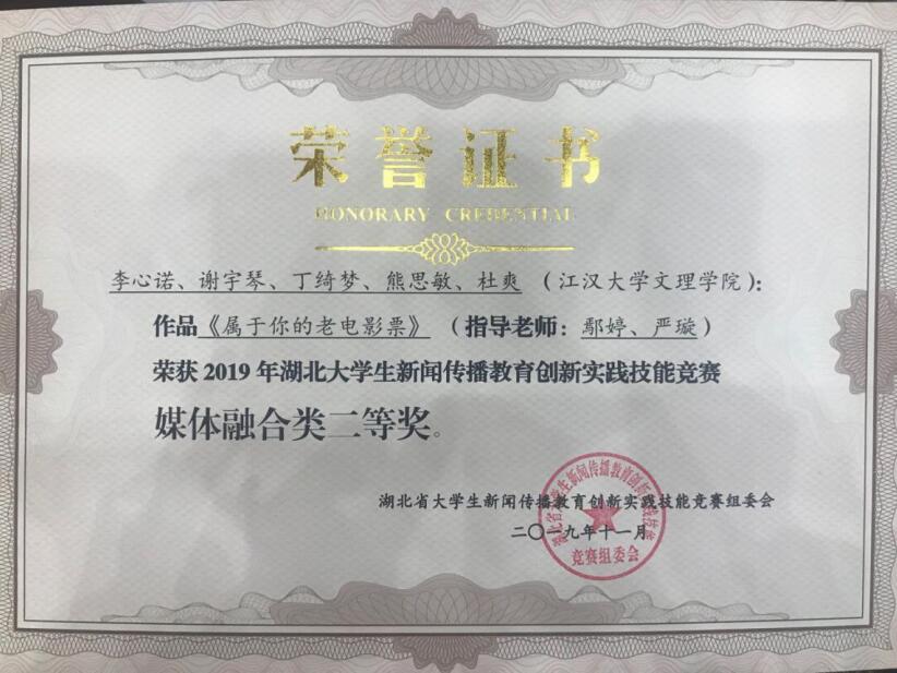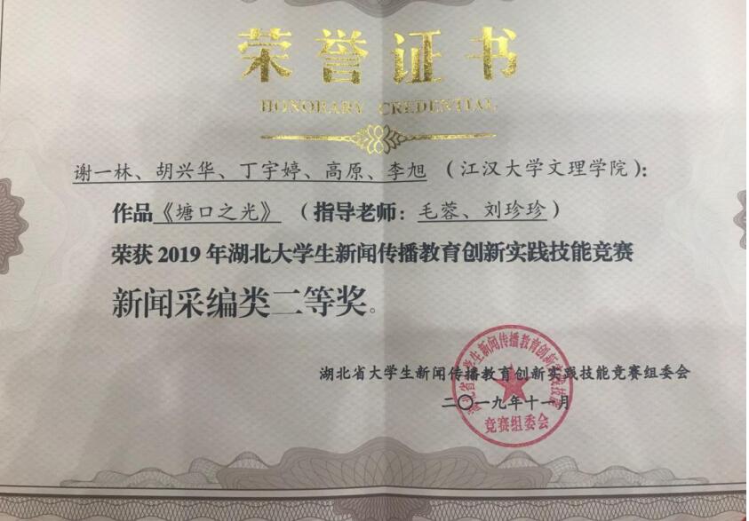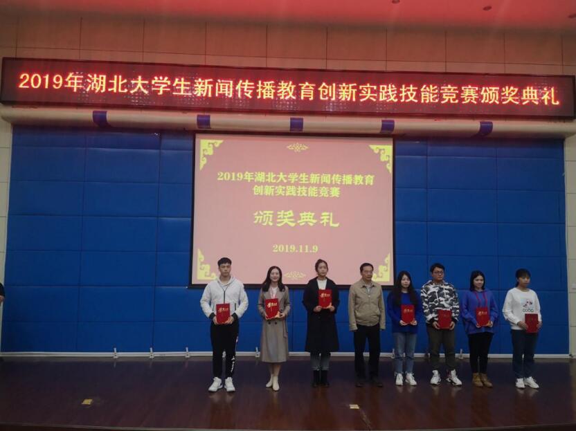 本网讯 近日,2019年湖北大学生新闻传播教育创新实践技能竞赛颁奖典礼上传来喜讯,我校新闻传播系学子与武汉大学、华中科技大学、华中师范大学等43所高校同台竞技,斩获6项大奖,除了在传统的新闻采编类、微视频类持续保持优势以外,新增类别媒体融合类也取得了突破。