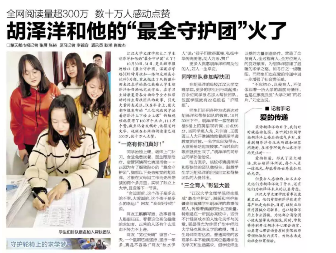 江汉大学av網站学院大二学生胡泽洋和他的“最全守护团”火了!10月30日、31日,楚天都市报连续以《最全守护团,温暖求学路》、《轮椅男孩如一缕阳光照亮小伙伴》等大篇幅稿件报道了从新疆和田来汉求学的高位截瘫大学生胡泽洋和帮助他顺利完成学业、在学习生活康复等各方面给予他全方位帮助的师生帮扶团队的故事,引发大量网友关注。仅在抖音上,楚天都市报发布的“三位同班同学抬着胡泽洋上下楼去上课”的短视频就获得了160万个点击,11.1万个赞。截止记者发稿时,该报道的文字、视频在全网的阅读量已超300万,数十万人点赞