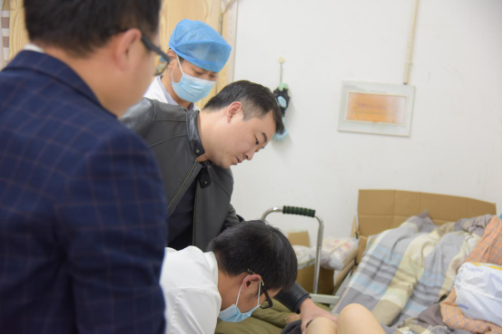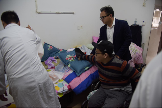 在政法学院刘超老师和班长姚人龙的帮助下,李志超医师和刘胜利医师将其扶到床上,为胡泽阳同学的褥疮伤口进行了清理,并为他换药包扎,在治疗过程中,李医师和胡泽洋进行亲切的交流,并告诉他如何防止伤口发炎,避免伤口恶化。