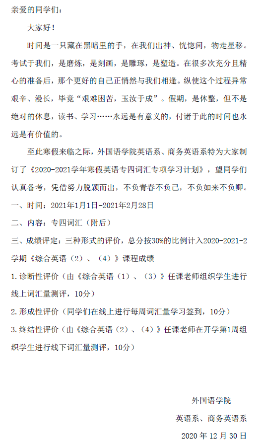 在寒假来临前,外国语学院在调研和充分准备的基础上,为同学们制定了《寒假英语专四词汇专项学习计划》。鼓励并督促同学们坚持学习、保持状态,过一个充实又有意义的寒假。