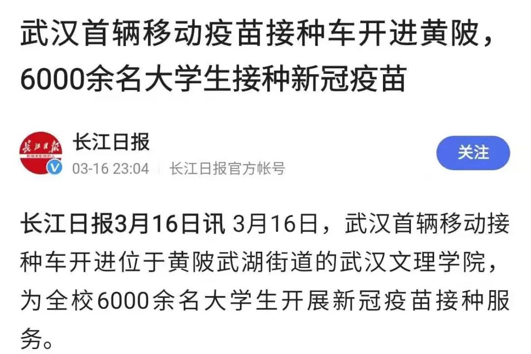 长江日报 | 武汉首辆移动疫苗接种车开进黄陂,6000余名大学生接种新冠疫苗