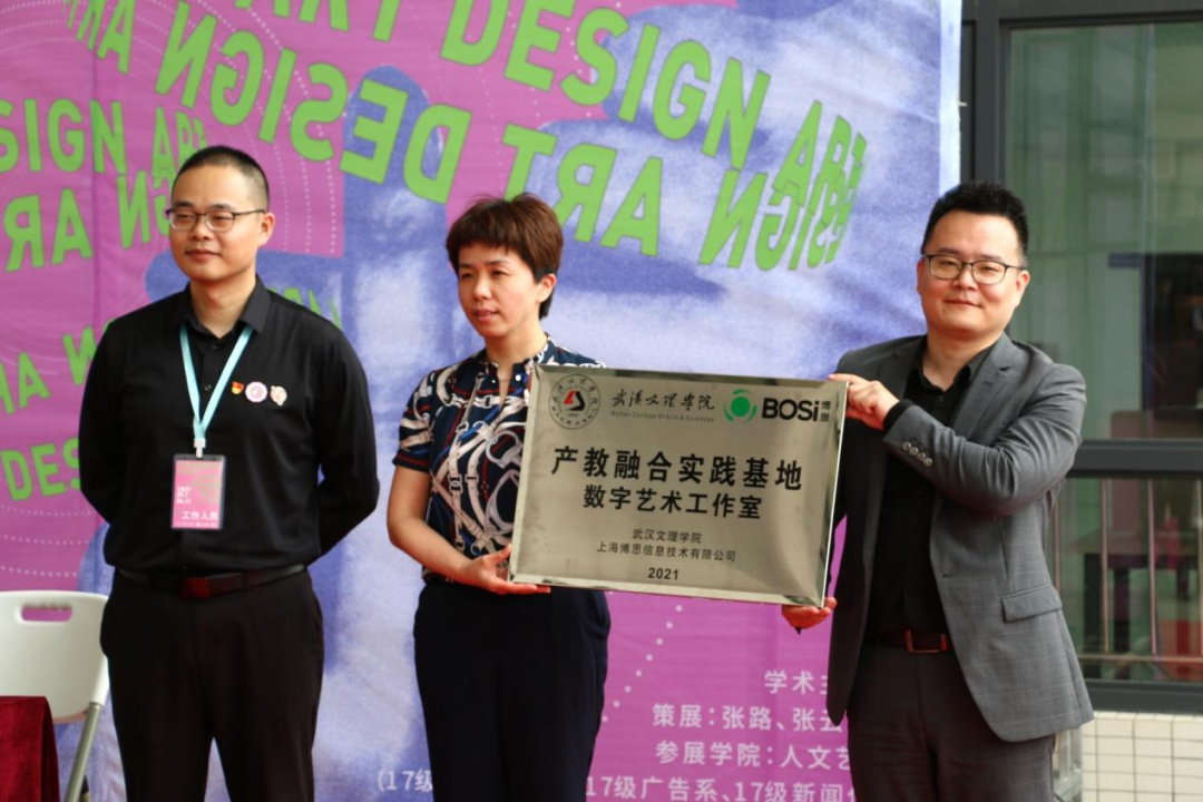 博思(中国)武汉分部总经理刘建致辞。刘建介绍了博思未来的业务布局,以及作为教育部认定的“协同育人产教融合”企业与百余所高校开展的合作模式。发言完毕后,刘建与人文艺术学院常务副院长吴聪进行了“产教融合实践基地——数字艺术工作室”的签约仪式,与人文艺术学院教学副院长鄢婷完成了授牌仪式。