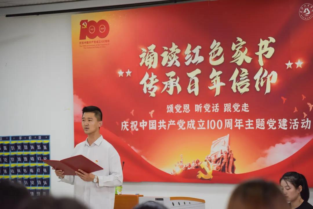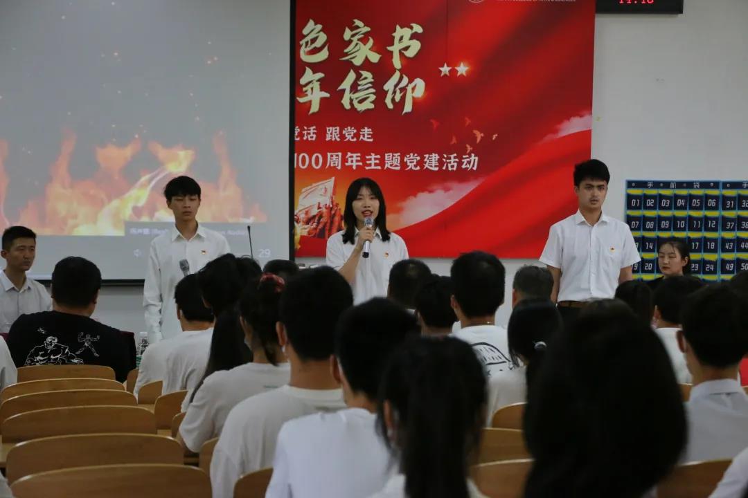 “读一读红色家书,忍不住泪眼模糊”。活动开始,由王梦成分享了开国元帅聂荣臻写给父母的信。王梦成是一位参军8年重返校园的“兵哥哥”,成绩名列专业第一,弥足珍贵的大学生活夯实了他的时代责任感,同时也加深了他对自身肩负使命艰巨性的认识。他慷慨激昂地演讲,为当代青年树立正确的人生观,培养高尚的道德情操树立了典范。演讲结束,记者问到王梦成入党缘由,他表示,“急难险重任务都是党员去冲锋涉险,我就是想冲在前面,保护群众,即使是在这样来之不易的和平年代也想像前辈一样,贡献自己的一份力量。”