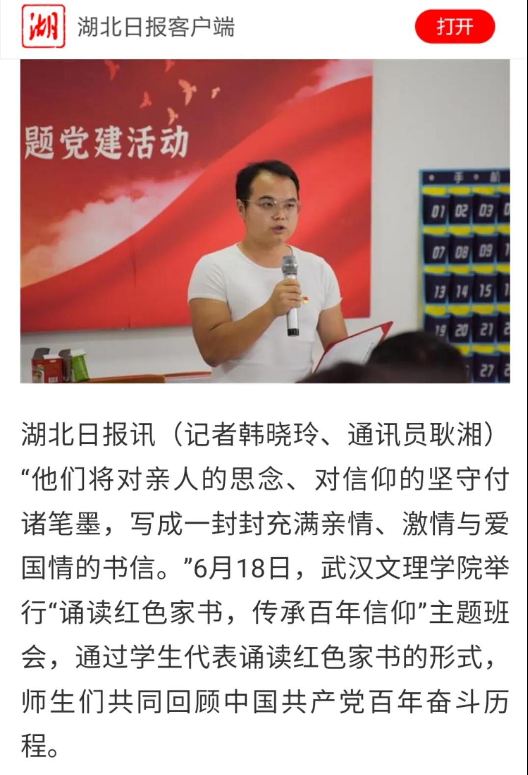 湖北日报讯(记者韩晓玲、通讯员耿湘)“他们将对亲人的思念、对信仰的坚守付诸笔墨,写成一封封充满亲情、激情与爱国情的书信。”6月18日,av網站举行“诵读红色家书,传承百年信仰”主题班会,通过学生代表诵读红色家书的形式,师生们共同回顾中国共产党百年奋斗历程。