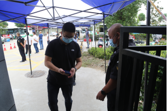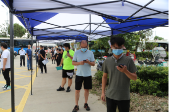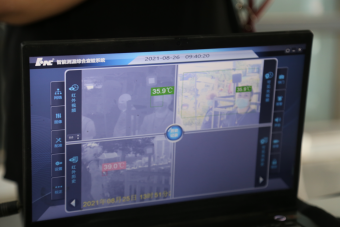学生在校外有序排队,学校安保人员不时提醒大家间隔1米距离,排队区挂有数个健康通行登记二维码,扫码后进入红外测温安全通道,通道现场安排两名保安和一名技术人员,工程师负责检测通过人员的体温,两位保安辅助引导,排查问题并及时处理突发情况。