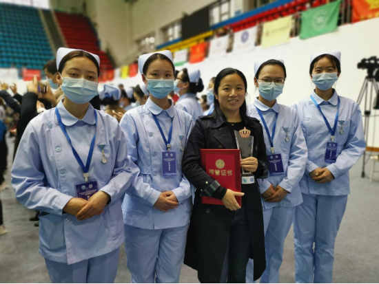 秉承“以赛促教,以赛促学”,曹老师所在的护理系除了每年校内举办护理技能比赛外,更是创造机会带领学生走出去。2021年曹老师带队护理学生参加第十届中国大学生技能大赛护理学赛道华中华南区赛并荣获团体三等奖。本次比赛是第一次参赛,没有任何经验可以借鉴,她带领老师们多方查阅资料,自己设计模拟多站式技能比赛的临床案例。因任务重,时间紧,为了确保训练效果,她更是牺牲清明等节假日和周末时间,给同学们进行集训指导。