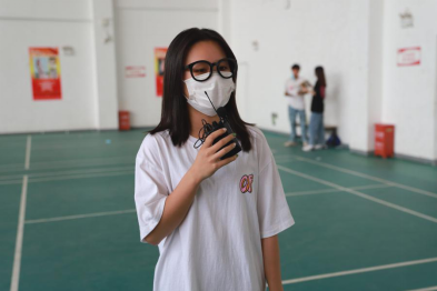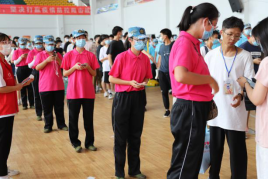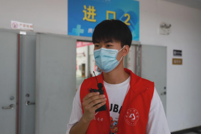 “同学你好,天气热,也请戴好口罩。”在检测现场,身穿红色马甲的学生志愿者一直奋战在第一线,在检测现场引导和分流待检人员、协调现场秩序。学校保卫处的安保人员负责秩序维护和现场协调工作。主动报名担任志愿者的陈思宇同学负责在现场引导受检人员入场,他希望自己能为本次学校组织的核酸检测活动尽自己的一份力量。“我们会在出口和入口控制人流量,在体育馆内会控制大家一米的安全距离,检查大家是否佩戴口罩并且发放口罩。”