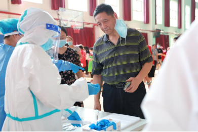 常明霞是本次进行核酸检测的一名医务人员,她说到,“我们两位检测人员为一个小组,共12个小组,两人合作进行核酸检测工作。”在交接班间隙,记者看到常明霞仔细地将身上的防护服脱掉,里面的衣服已被汗水浸透,防护镜也变得模糊。“师生们都非常配合抗击疫情,即使在酷暑烈日下也没有人抱怨,心里挺温暖的。感谢每一位有序等待、认真配合接受检测的人员。作为一名医务人员,我们会坚守好岗位。”