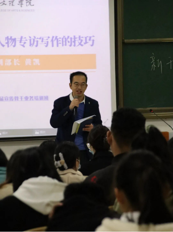 黄老师还为同学们分享了一些写作小技巧,帮助同学们更好地去进行校内宣传工作。他从“一篇好文章应具备的三个特质”、“如何培养新闻敏感和新闻触角”、 “如何精心设计新闻标题” 、“如何写好导语”、“如何提高文章站位”等五个方面来和同学们讨论如何去写好一篇文章。现场同学与黄凯老师积极互动,踊跃发言。
