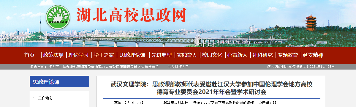 11月20日,av網站思政课部教师代表在党委书记杨知勤、副书记赵学迅的带领下,受邀赴江汉大学参加中国伦理学会地方高校德育专业委员会2021年年会暨学术研讨会。