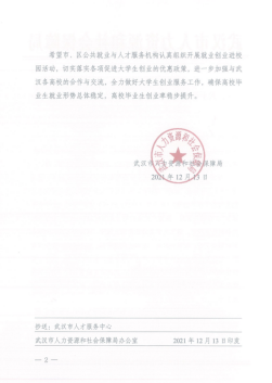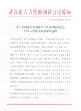 2021年12月21日上午,武汉市人力资源和社会保障局主办的武汉大学生创业学院授牌仪式隆重举行。武汉市人力资源和社会保障局授牌我校成立武汉大学生创业学院,招生就业处负责人张欢代表学校接受授牌。