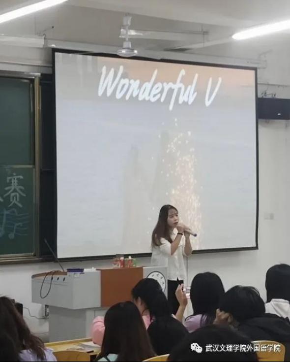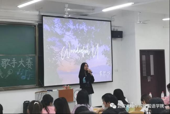 21级法语班罗欣怡的一首《Wonderful U》更是将观众们带回那个深切的回忆之中,歌声婉转动人。将女生在爱情中爱而不得的遗憾展现的淋漓尽致,赢得观众们的阵阵掌声。