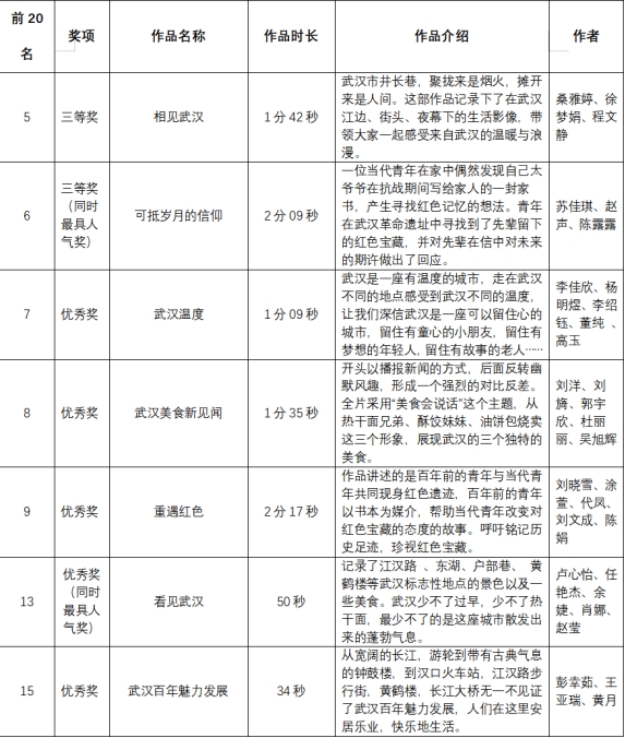 近日,由中共市委网信办、共青团武汉市委员会指导,武汉广播电视台联合腾讯主办,我校参与承办的“红心耀百年,青春正飞扬”第二届青年短视频创意大赛完美收官。我校荣获“最佳组织奖”奖项。参赛学生作品在大赛中质量和数量上再创新高,斩获最佳人气奖一部、三等奖二名、优秀作品多部的好成绩。其中,两个团队获得腾讯提供的价值10000的项目启动资金 ,一个团队获得5000元奖金。