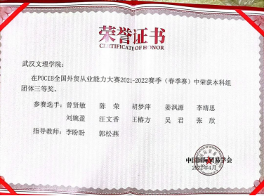 4月29日,商学院国际经济与贸易系教师李盼盼、郭松燕指导2019级国际经济与贸易专业学生胡梦萍等10名同学荣获由中国国际贸易学会第十一届POCIB全国大学生外贸从业能力大赛团体三等奖的佳绩。