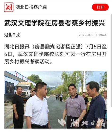 2022年7月5至6日,学校校长刘可风、副校长胡立君一行赴十堰市房县白鹤镇伏溪堰村调研乡村振兴和驻村帮扶工作,开展“下基层、察民情、解民忧、暖民心”实践活动,了解当地产业发展和美丽乡村建设等情况,考察镇村特色企业和项目,并慰问了学校驻村工作队,看望教育学院送教送培教师团队。