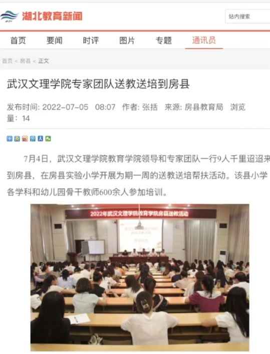 7月初,学校教育学院党总支书记曾鹏、副院长贺霞、综合办公室副主任杨帆等一行10人去到湖北省房县,展开了为期一周的“送教送培”帮扶活动,该县小学各学科和幼儿园骨干教师600余人参加培训。
