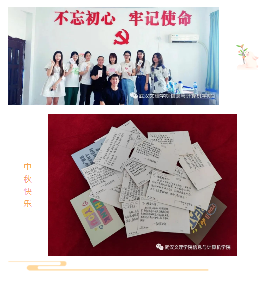教师节撞上中秋节,让这个中秋不一样的美好。节日前夕,信息与计算机学院的学子为老师们准备了贺卡,小小的贺卡传递着学子对老师的满满得爱意与敬意,贺卡后面同学们认真写下祝福语,字里行间流露出对老师的感激之情。同学们将满载节日祝福的贺卡赠予自己敬爱的老师,在表达感激之情的同时也祝愿老师双节快乐,身体健康,工作顺利。