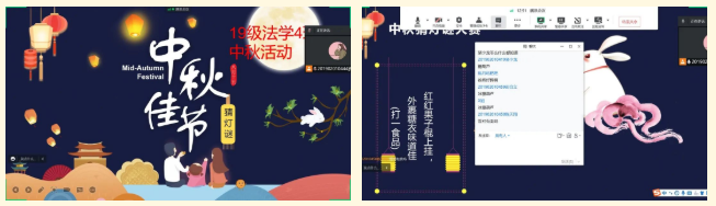 20级法学二班主要通过班会向同学们介绍中秋节,中秋节在我国有着悠久的历史,是我国重要传统节日之一。古代更有但愿人长久,千里共婵娟的美好祝愿。中秋佳节更成了人们祈求和家团圆家人幸福美满都日子。通过开展此次线上会议,让同学们能够更好了解中国传统文化,同时通过大家一起齐聚过中秋佳节,寄托浓浓相思之情。