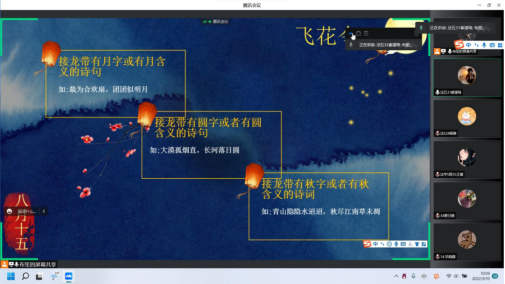 在飞花令和猜灯谜环节,同学们都纷纷积极参与,加入到游戏环节中。过程中欢声笑语不断,同学之间的距离拉进了,未在家乡与家人团圆的中秋之日也能体会到与友相聚、共同赋诗的乐趣。既能增进同窗情谊,又能学习中国的传统诗词文化与节日之礼。