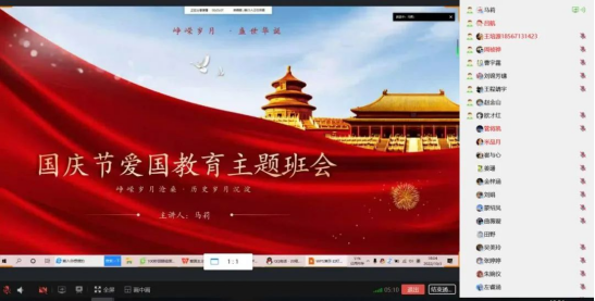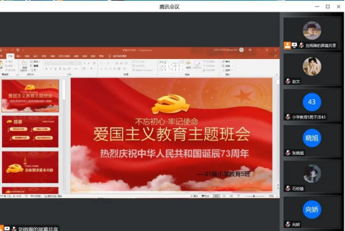 为了庆祝中华人民共和国诞辰73周年,21级小学教育5班召开了一次爱国主义教育的线上主题班会,增强同学们的爱国主义意识。班会从新时代爱国主义教育总体要求及内容、丰富爱国主义教育、营造爱国主义氛围和加强对教育的组织领导四个方面进行展开,同时向同学们介绍了爱国主义精神的内涵与意义。