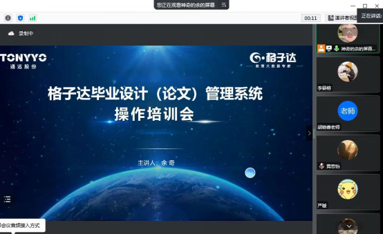 此外,为了加强学校对参与毕业论文(设计)指导教师的管理,10月19日下午2:00,针对指导教师举行了格子达毕业论文(设计)管理系统线上培训会。格子达管理系统技术负责人余奇工程师围绕本科毕业论文(设计)任务书、文献综述、开题报告、中期检查、论文进展表填写以及论文答辩意见等操作流程做了仔细解读,解决教师在指导毕业论文(设计)中遇到的问题,指导他们做好后期论文评阅和答辩工作。