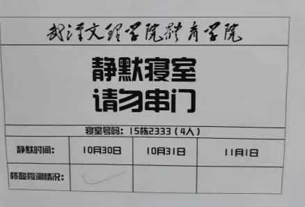 近期武汉疫情形势异常严峻,恰逢有学生需外出参加2022年下半年教师资格证考试。根据当前疫情防控要求,为确保全校师生生命安全和身体健康,维护学校安全稳定,学校经过研究部署后决定对外出参加教资考试的学生及其所在宿舍实行静默管理。为保障静默学生宿舍后勤服务落实到位,医务人员核酸采样工作高效有序进行,体育学院综合办公室副主任黄小斐老师召集学生骨干,组建志愿者小分队开展各项后勤保障工作。