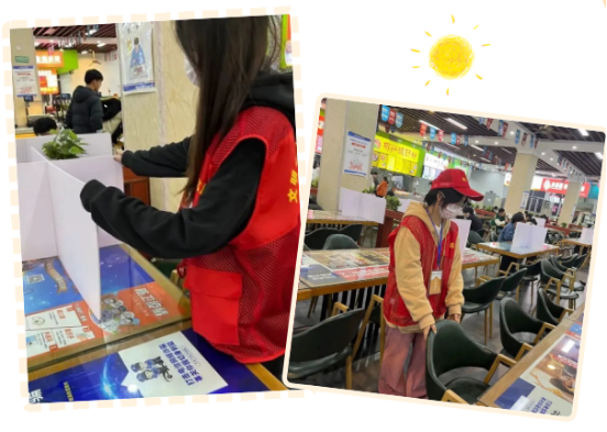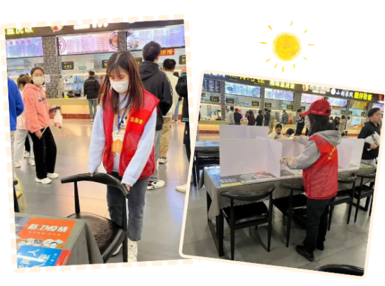 食堂门口、就餐位置旁、垃圾回收处都可以看见外院志愿者们认真“工作”的身影,他们尽心尽力维护食堂就餐秩序,引领文明就餐新风尚。