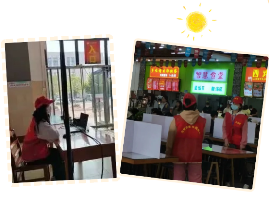 他们有的在食堂内维持就餐秩序,主动提醒、引导就餐师生正确入座用餐;有的在食堂入口处督促学生进入食堂戴好口罩,提示就餐师生餐前洗手。在同学们用餐完离开餐桌之后,志愿者会摆正桌子上的隔离板和座椅;在同学们在排队买饭出现队伍混乱并造成拥堵的时候,志愿者们会及时疏通队伍使之有序;在食堂秩序良好时,志愿者会巡逻查看食堂环境,为有需要的同学提供帮助……