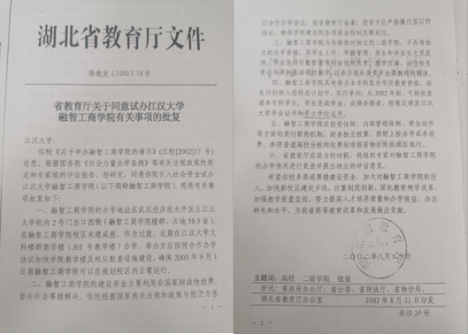 2002年8月,湖北省教育厅批复同意试办江汉大学融智工商学院。