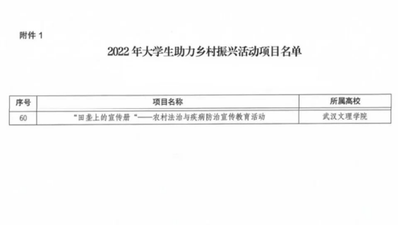 我校“律诗”志愿服务小队举办的项目“田垄上的宣传册--农村法治与疾病防治宣传教育”被武汉市2022年大学生助力乡村振兴活动立项。