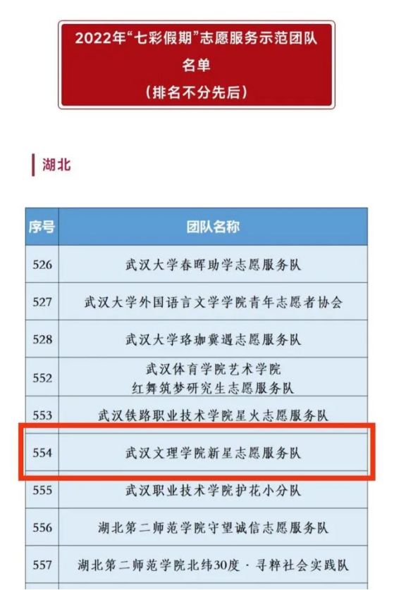 “七彩假期”活动中,我校“新星志愿服务队”被列为团中央示范服务团队。