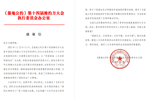 近日,我校团委收到来自《湿地公约》第十四届缔约方大会执行委员会办公室的感谢信,对我校所有参与人员表示衷心感谢。