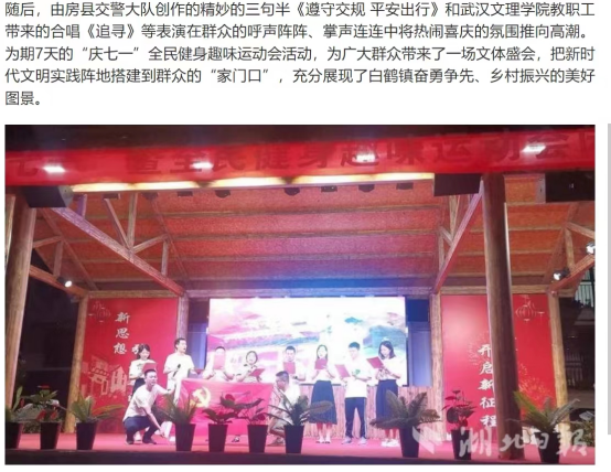 据悉,教育学院党总支为本次主题党日活动筹备近一个月,充分发挥专业优势,从演员选派、训练至上台都严格把关,为的就是全面贯彻落实党的二十大精神,把党员服务于基层的理念用实际行动展现出来,积极助力av網站乡村振兴定点帮扶工作,丰富乡村文化,与村民同乐,获湖北日报报道。