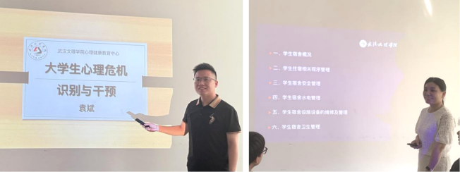 随后,大学生心理健康教育中心袁斌从学生心理危机干预处置基本流程、如何识别心理危机学生、发现危机学生干预措施三个方面对新进辅导员进行了专项培训。