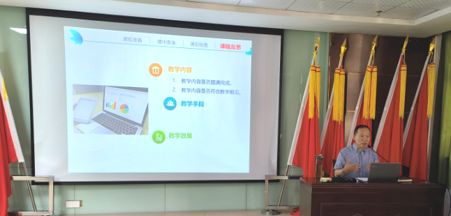 外国语学院教学副院长徐江副教授以“怎样上好一节课”为主题,从“课前准备、课中表演、课后检查、课程反思”四个方面进行讲述,并拓展到从板书、教案、练习与作业等方面对新进专任教师展开专项培训。