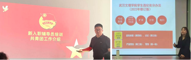 辅导员专项培训中,学生处副处长曾鹏介绍了辅导员的工作职责,杜晓倩、代欣、何昱霖、陈慧分别从大学生思想政治工作和奖惩工作、奖勤助贷、学生事务及学生宿舍管理等方面进行了详细讲解,帮助新进辅导员快速进入角色。