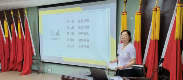 教务处副处长邓弥弥从课堂教学管理规定、考试工作管理办法、考试阅卷和评分规范、学籍管理实施办法、重修管理办法以及教学事故管理办法等方面详细讲解了教学管理规范的内容。学生处副处长王璇介绍了学生管理方面的班主任制度。学校办公室副主任黄凯老师从实际工作出发,讲解了公文的基本种类、公文文种与对应的用途、撰写方法和写作要点。