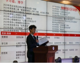 19位参评国家奖学金和润综合奖学金的同学按照抽签顺序进行成果展示。他们从优秀的专业成绩、学术成果、社会实践经验、创新能力以及综合素质积累等方面进行陈述,分享自己逐步坚定学习目标,砥砺奋进的心路历程。