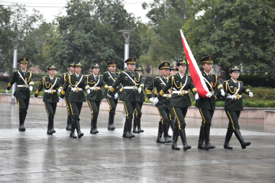 清晨7时,在濛濛细雨中,英姿飒爽的国旗护卫队队员迈着矫健的步伐护送国旗入场。在雄壮的国歌声中,五星红旗冉冉升起,飘扬在校园上空,全体师生行注目礼,向国旗致以最崇高的敬意。