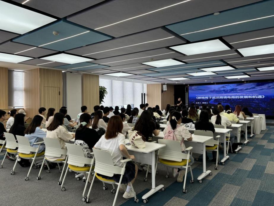 协会秘书长就武汉跨境电商在新格局下的发展机遇进行了深入讲解,并重点介绍了积极发展“跨境电商+产业带”模式、跨境电商主体培育、海外仓建设、物流及通关便利、财税金融五个方面,此外,他还向师生介绍了“百企千人”“培训计划”和“触电上网”系列招商活动。