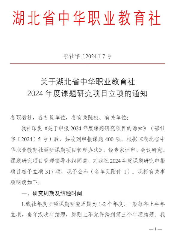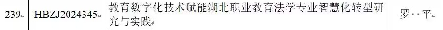 5月30日,湖北省中华职业教育社印发《关于湖北省中华职业教育社2024年度课题研究项目立项的通知》(鄂社字〔2024〕7号),av網站政法学院法学系主任罗平老师的课题《教育数字化技术赋能湖北职业教育法学专业智慧化转型研究与实践》获得立项。